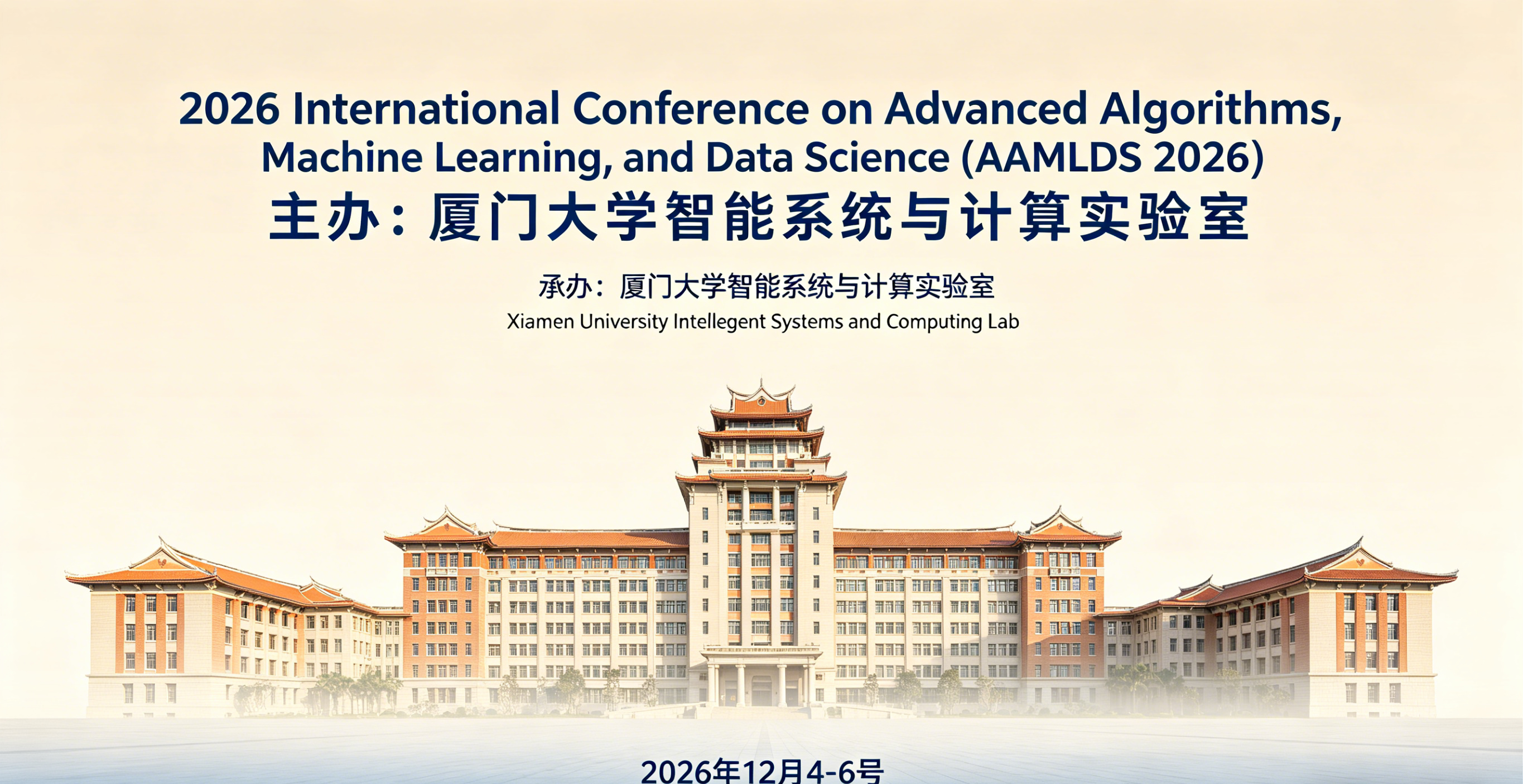 2026 年高级算法、机器学习与数据科学国际会议将于2026年12月4-6号在中国厦门举行。该会议由厦门大学智能系统与计算实验室主办;厦门大学智能系统与计算实验室承办;;在即将举行的该次会议上,我们邀请到学术领域的知名教授将与参会者分享在高级算法、机器学习与数据科学的最新创新和研究成果。会议将主要以知名专家的主题演讲和作者的同行评审的论文报告为特色。此外,还将为参会者安排社交活动或学术访问,以促进该领域研究人员之间的交流、讨论与合作。